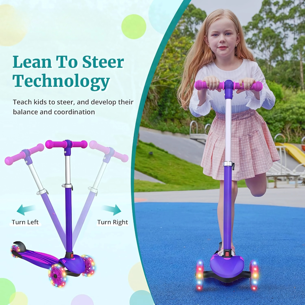 Introduce a smooth ride experience with the Three Wheel Kids Scooter with LED Lighted Wheels and Adjustable Height, crafted to provide reliable movement and steady control during everyday use. With three solid wheels for consistent support and lean steering, this scooter helps encourage balance and coordination during motion. Designed for growing users, it includes an adjustable handle height to match developing skills and preferences.